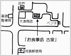 Cお食事処「古泉」 《祝島》 定食(600円)と一品料理(430円)が数種類ずつ。それと、持ち帰り用(280円)のメニューもあります。ビールと日本酒も飲めます。 《おすすめメニュー》「とりから甘酢あんかけ定食」600円。 【営業時間】11時〜20時 (テイクアウトは10時から) 【定休日】水曜日、第2・4火曜日 【電話】090-6906-3644 |