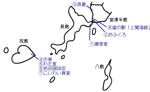 D喫茶「わた家」 《祝島》 定期船乗り場のすぐ近くの小道を入った所にあります。店内は祝島らしさをゆったりと感じられる空間です。祝島の特産品など、おみやげ品も販売しています。 《おすすめメニュー》「カレー」550円、「スコーン」200円、「祝島でブレンド・焙煎した珈琲」300円。 【営業時間】10時〜17時 【定休日】日曜日 【電話】090-7544-8169 |